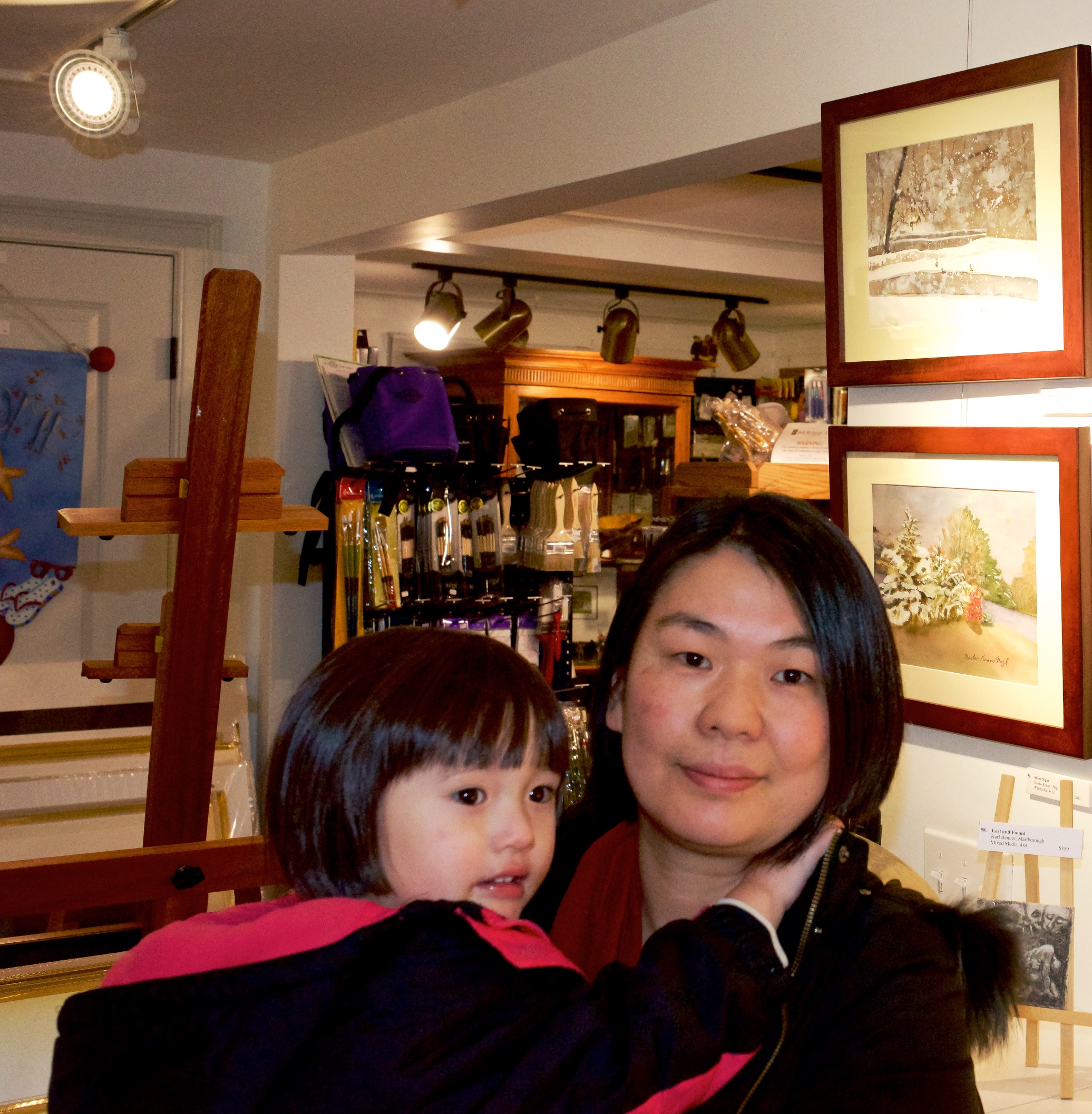 The frame store was not on the main street of the downtown. Therefore, we did not have as many visitors as on the main street during the weekend receptions at the frame store. There were 5 artists altogether including my husband and me, and we all enjoyed exchanging information on other galleries, art shows and so on. Participating in an art show is not just for showing and selling artworks, but artists can also get to know other artists and obtain very useful information on anything related to art. The owner and all the other artists were very nice to my 4 year-old daughter, too. She enjoyed talking with them and also got very excited when some visitors or customers came in with their dogs. The frame store owner told me that my daughter kept entertaining everyone at the store including the dogs.